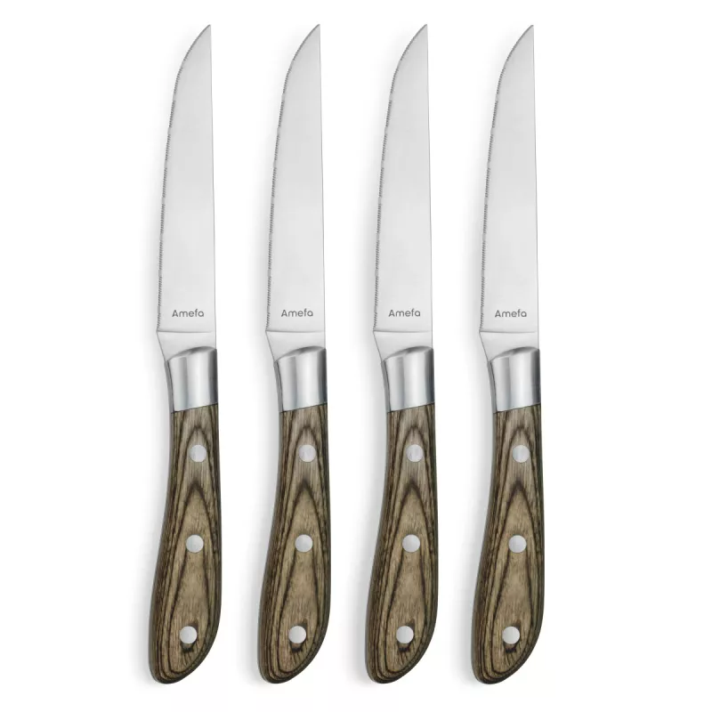 Doté d’un manche en bois fumé orné de trois rivets en inox, chaque couteau allie robustesse, résistance à l’humidité et élégance naturelle.