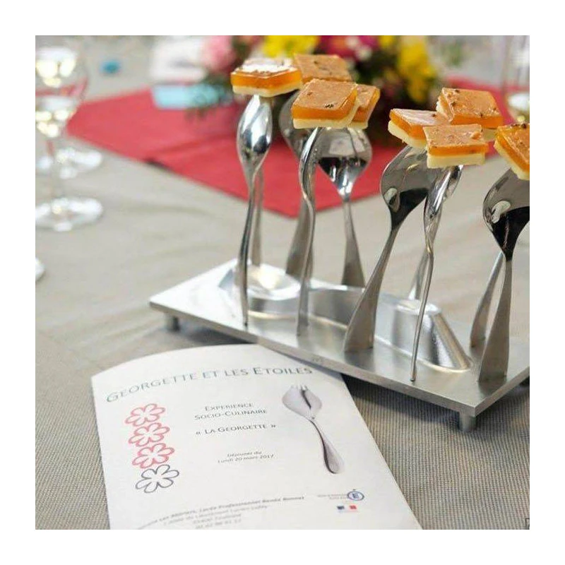 - Fourchette, cuillère et couteau à la fois, la GEORGETTE® est l’ustensile insolite et élégant, au service de l’amuse-bouche jusqu’au dessert.