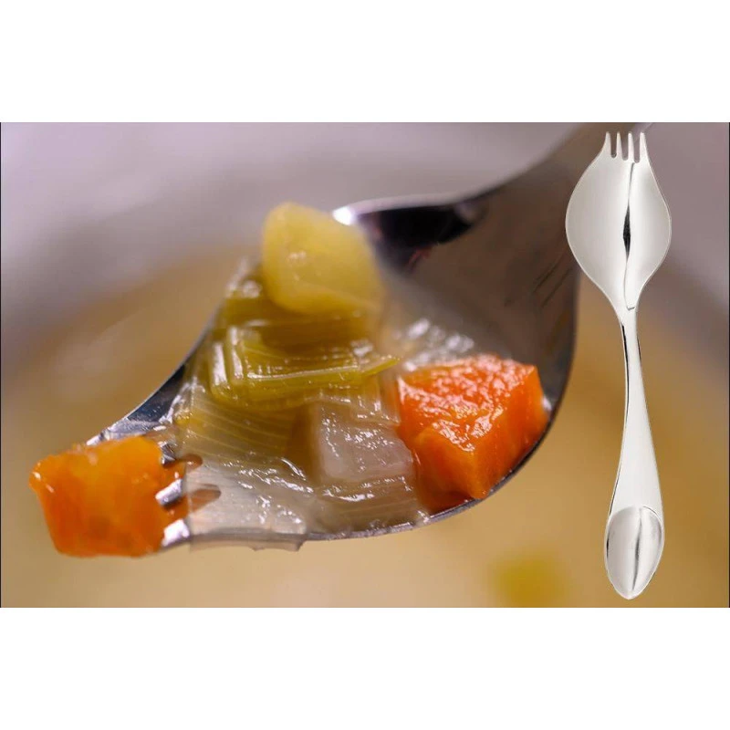 - Un manche ergonomique profilé et équilibré, constituent cet ustensile original réunissant à lui seul les fonctions séparatives des trois couverts habituels.
