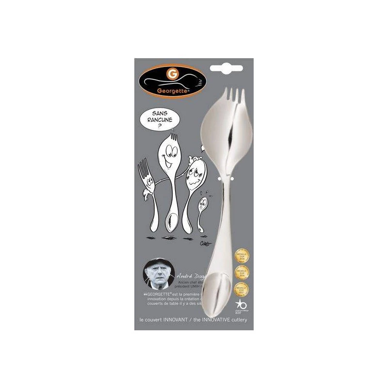 Fourchette, cuillère et couteau à la fois, la GEORGETTE® est l’ustensile insolite et élégant, au service de l’amuse-bouche jusqu’au dessert.