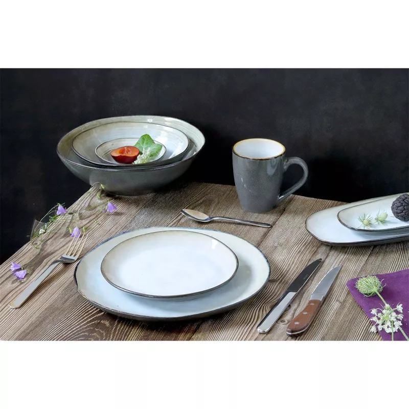 Une gamme d’articles de table de formes organiques en grès réactif émaillé et aux arrondis irréguliers.